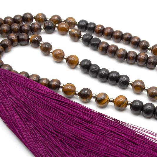 JAPA MALA 108 CUENTAS OJO DE TIGRE, ÁGATA Y MADERA CON BORLÓN MORADO