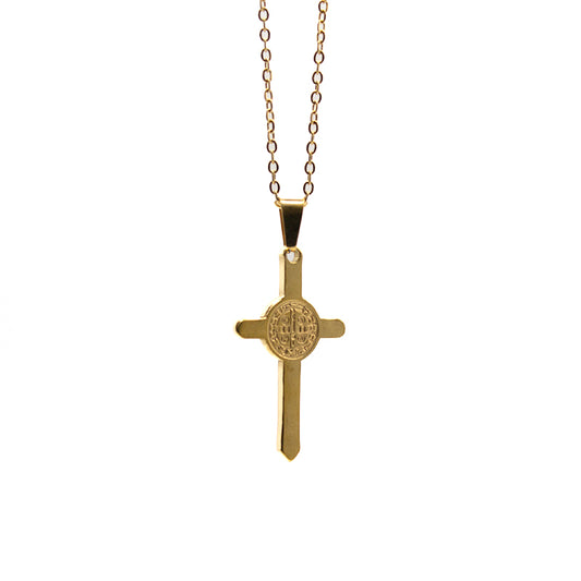 COLGANTE CRUZ CRISTIANA CON GRABADO CENTRAL DE LA CRUZ DE SAN BENITO DORADO