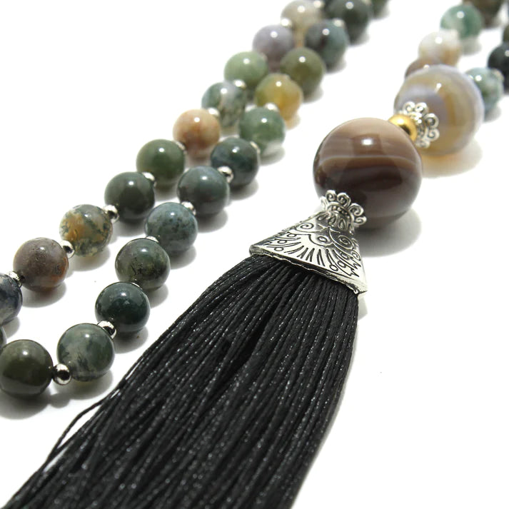 Quizás te surge la duda de qué es un mala y para qué se utiliza. Es muy fácil, es una especie de collar o rosario con 45 cuentas (bolas), que se utiliza en la meditación mientras se canta un mantra, oración o intención, una vez por cada cuenta. Es una herramienta antigua que se desarrolló para mantener la mente enfocada y clara de los pensamientos.
