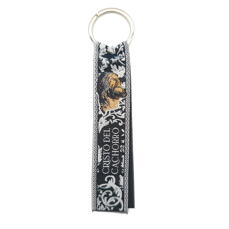 llavero cofradía Sevilla, llavero Cristo del Cachorro, amuleto religioso cristiano Sevilla, regalo religioso católico, llavero tela bordada cofrade, devoción Cristo del Cachorro, llavero Semana Santa Sevilla, accesorio cofrade original Sevilla.