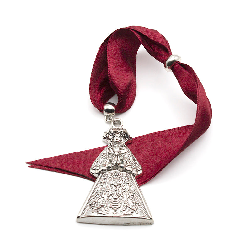 Amuleto Virgen del Rocío con cinta burdeos para coche, alta calidad y ritualizado.