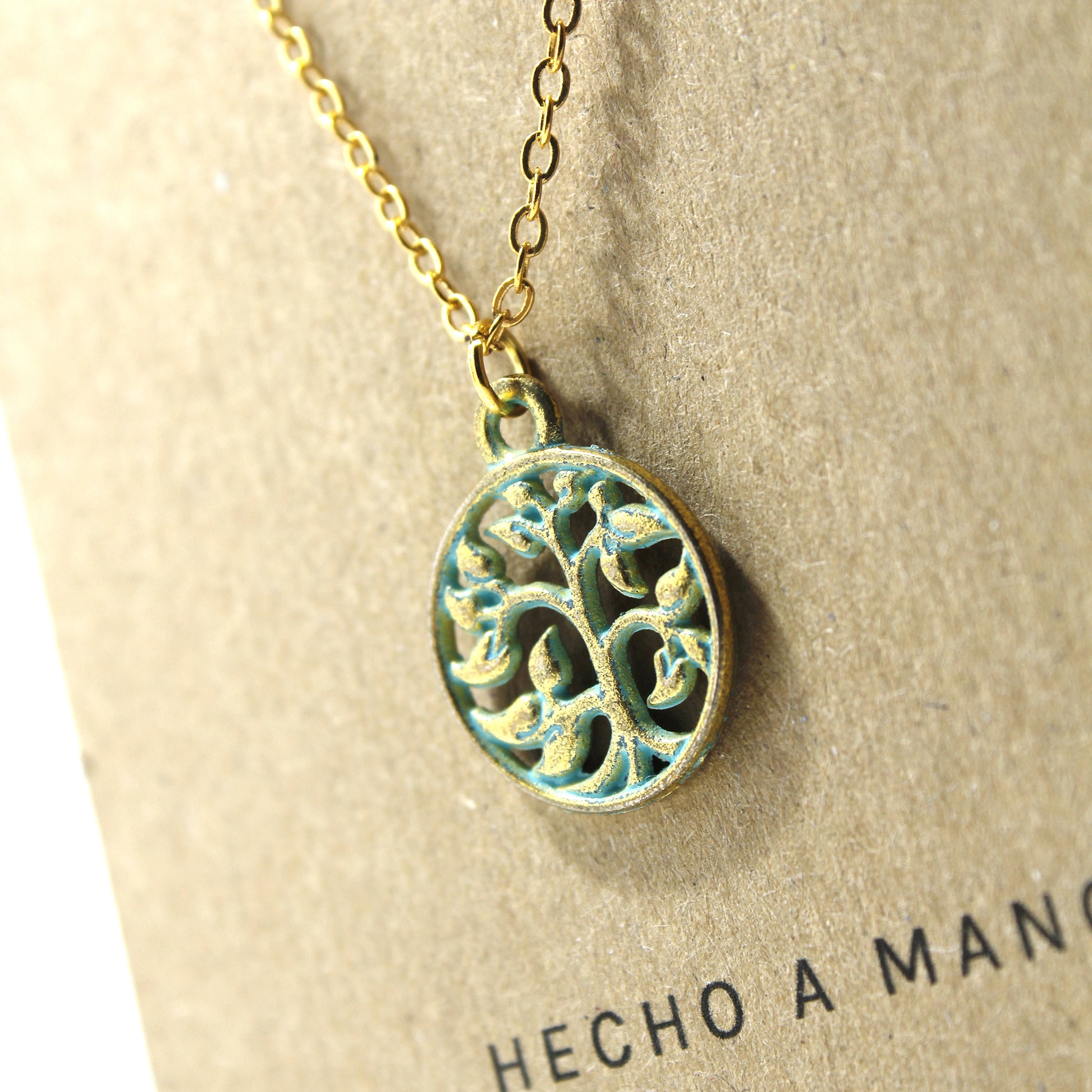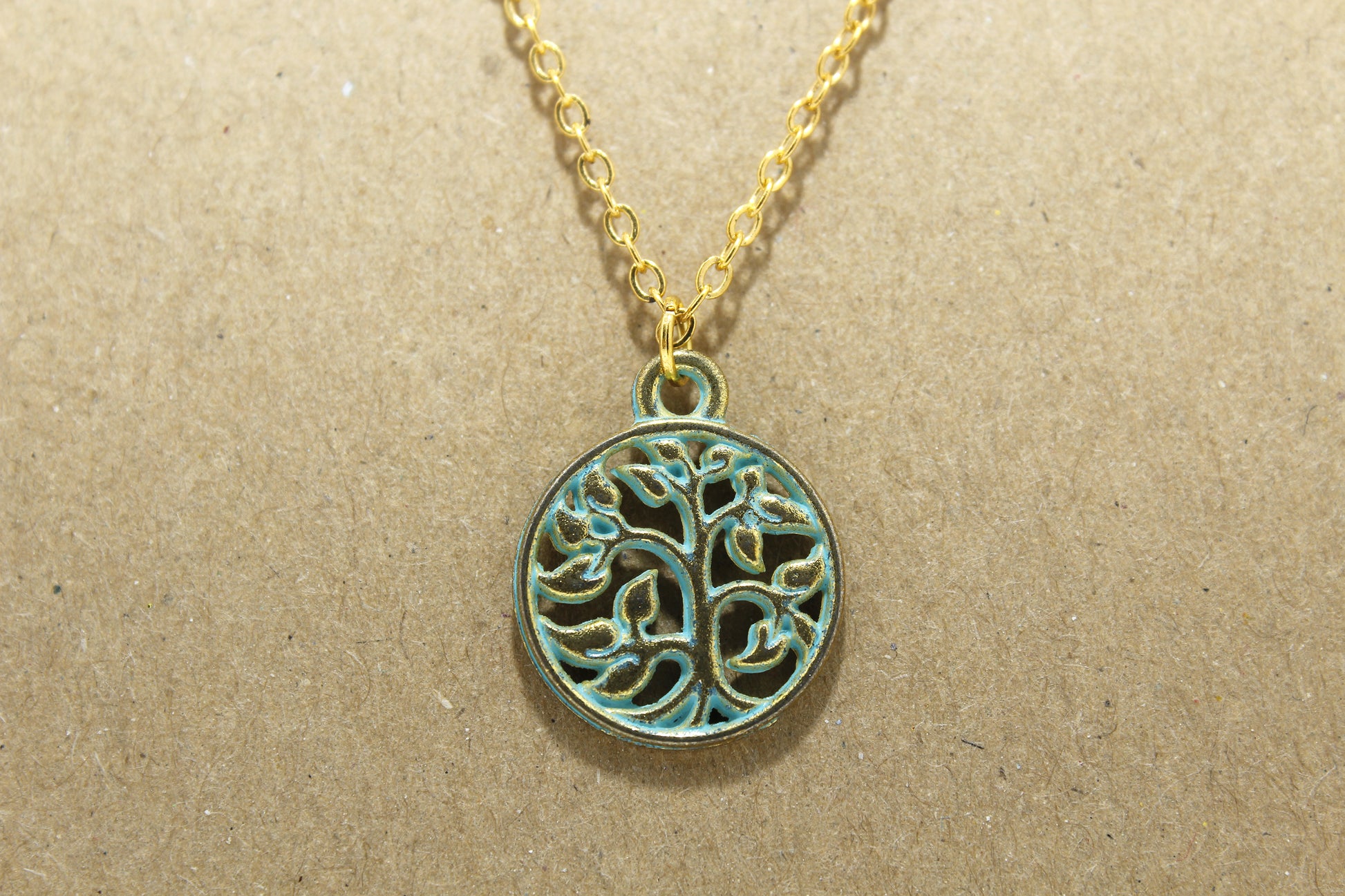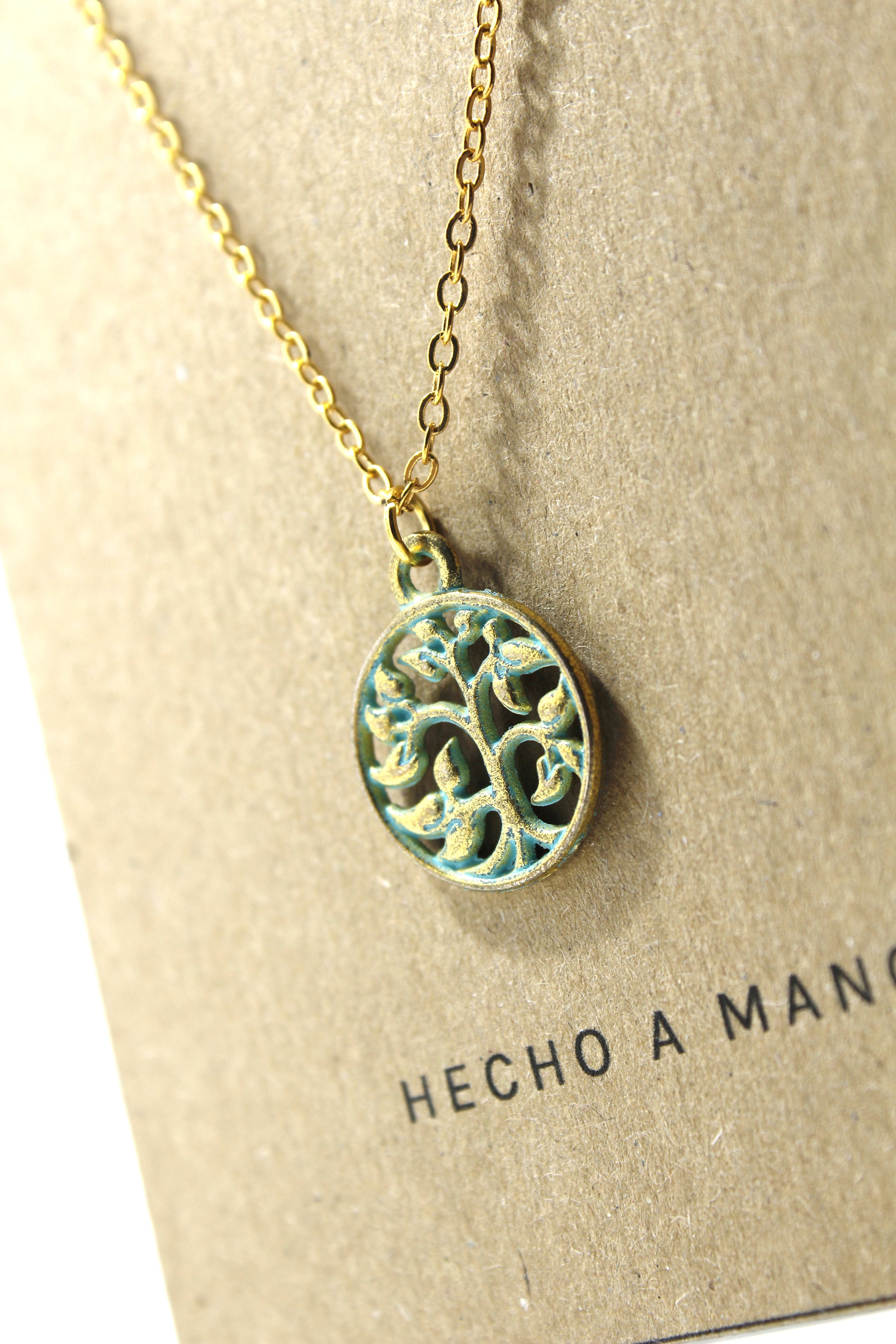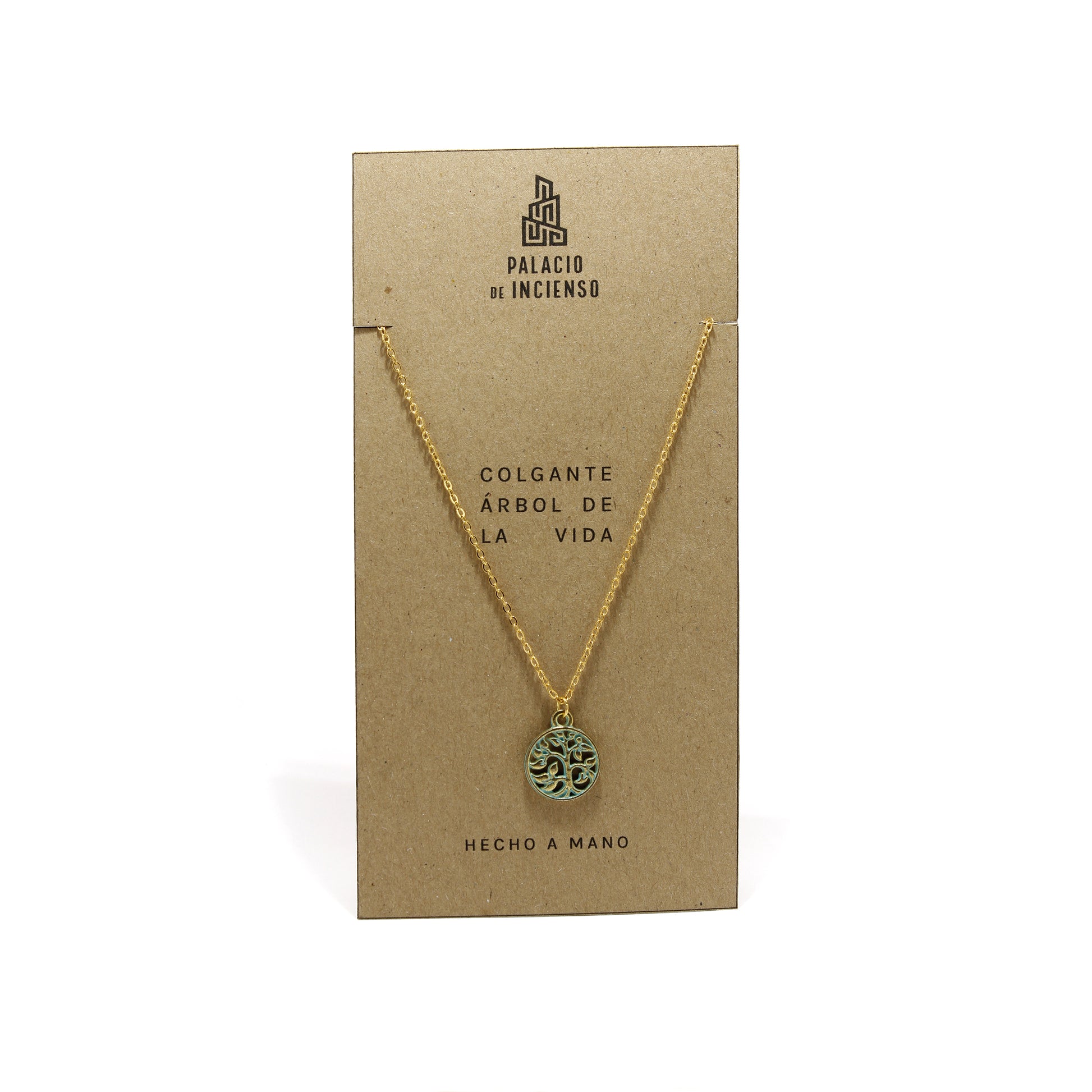 Amuleto Árbol de la Vida en metal color oro con tonalidades verdes y azules.