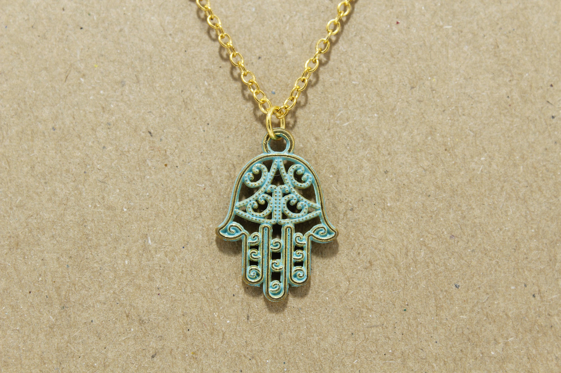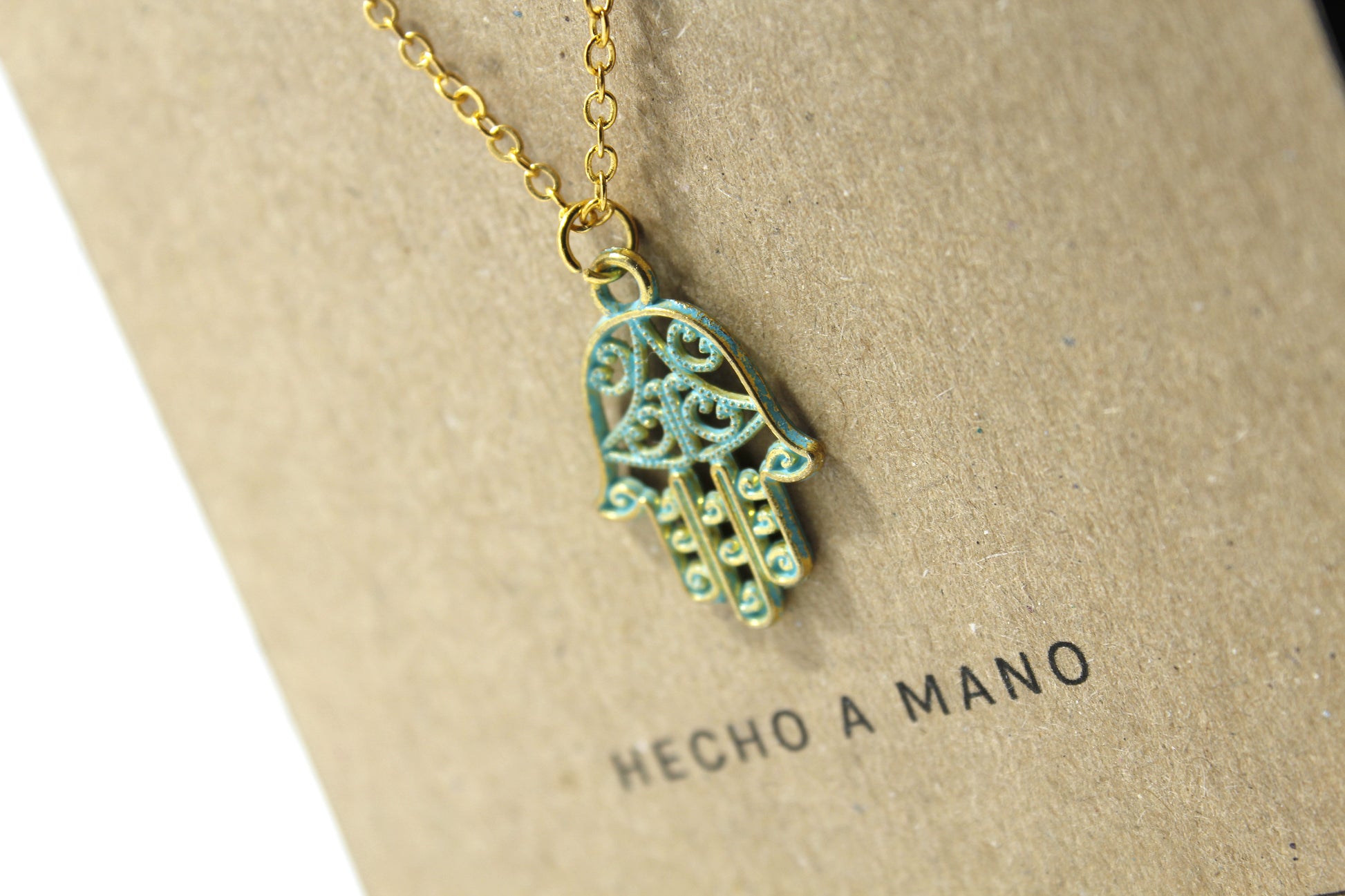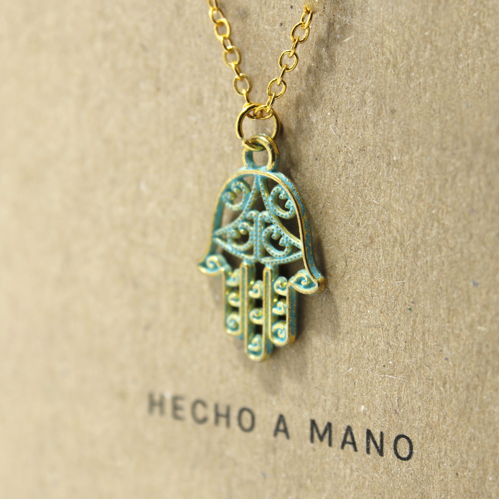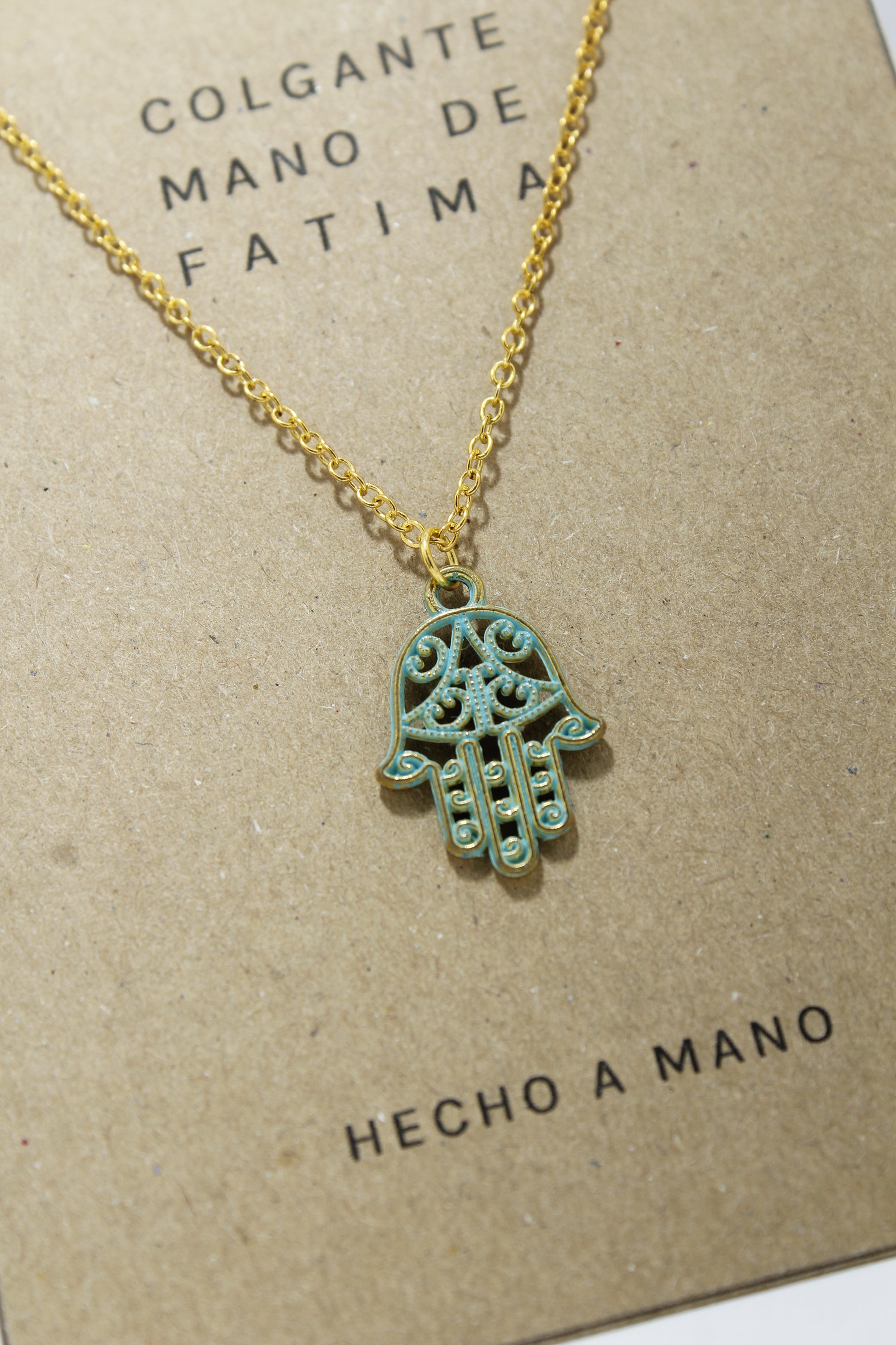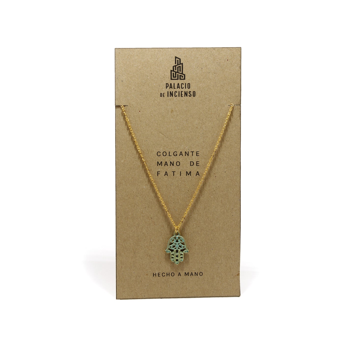 Amuleto Mano de Fátima en metal color oro con tonalidades verdes y azules.