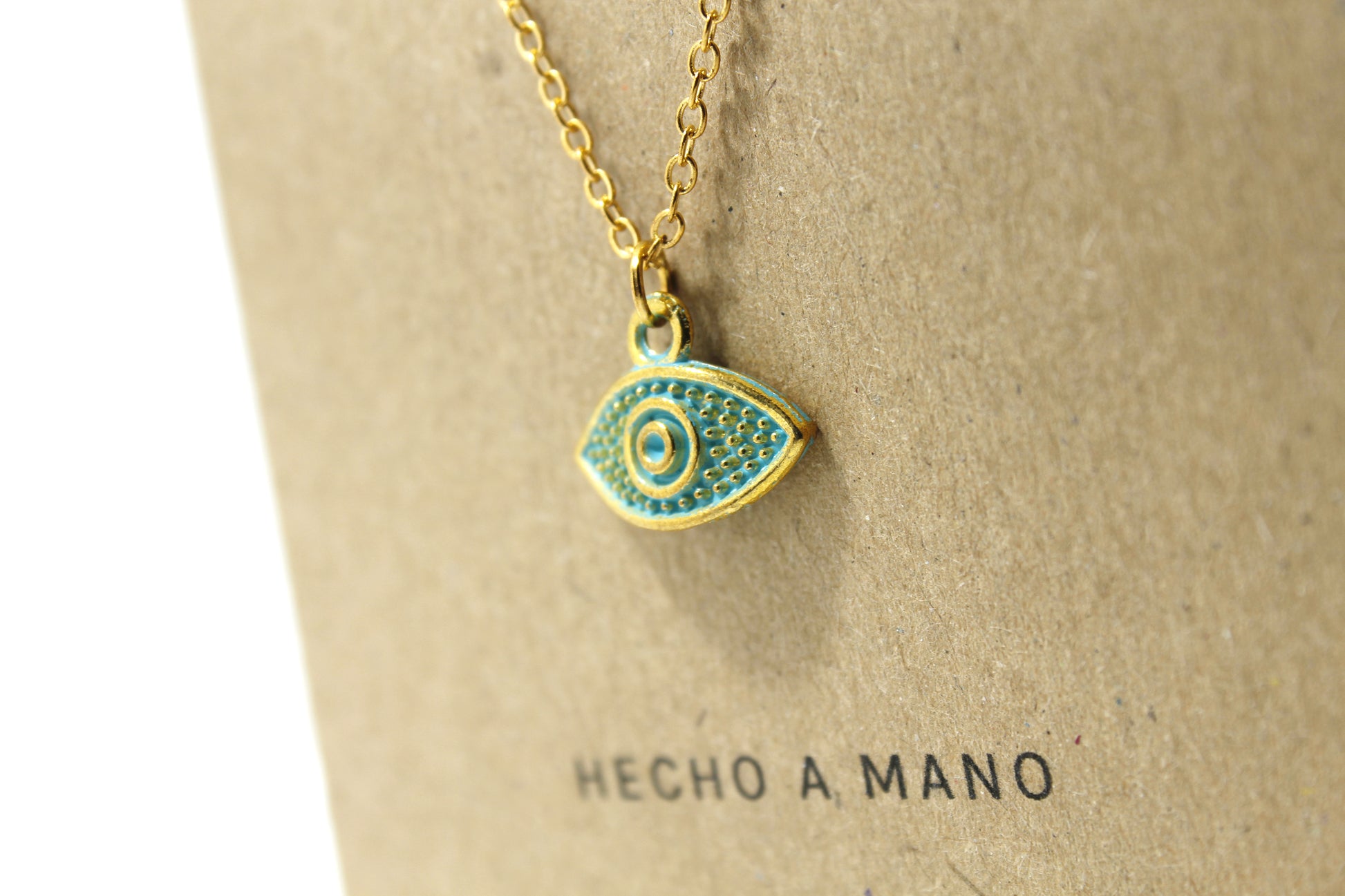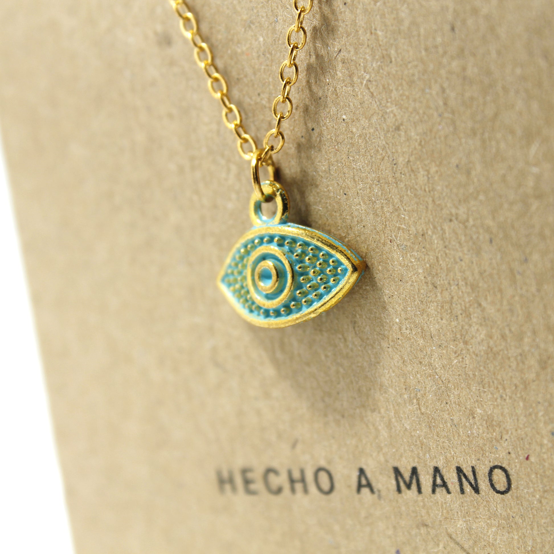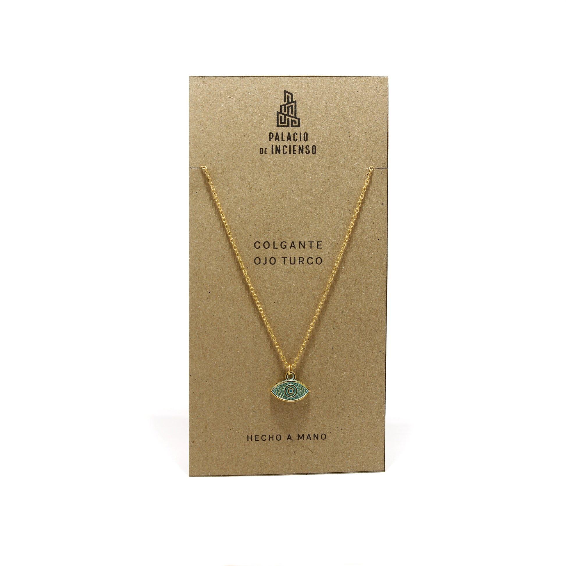 Amuleto Ojo Turco en metal color oro con tonalidades verdes y azules.