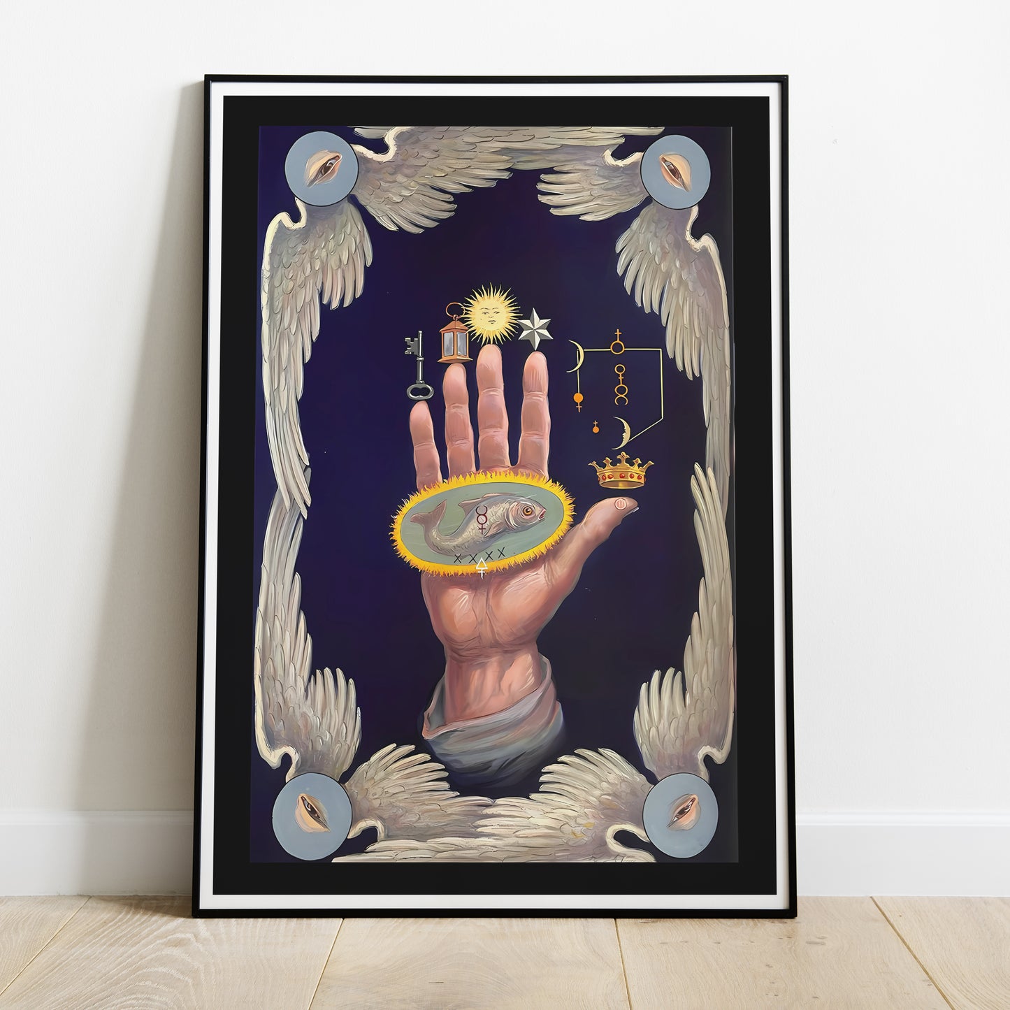 cuadro místico, Mano de los Misterios, decoración espiritual, símbolo esotérico, sabiduría y protección, arte esotérico, talismán decorativo.