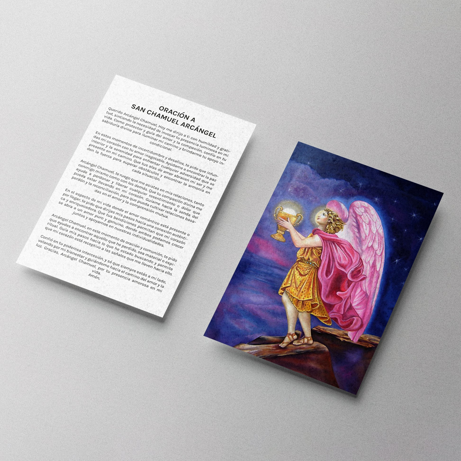 Amor y relaciones: El Arcángel San Chamuel es conocido como el "Arcángel del Amor". Al tener esta estampa cerca, se cree que puedes atraer y fortalecer relaciones amorosas, fomentar la armonía en el hogar y mejorar las relaciones con amigos y familiares.