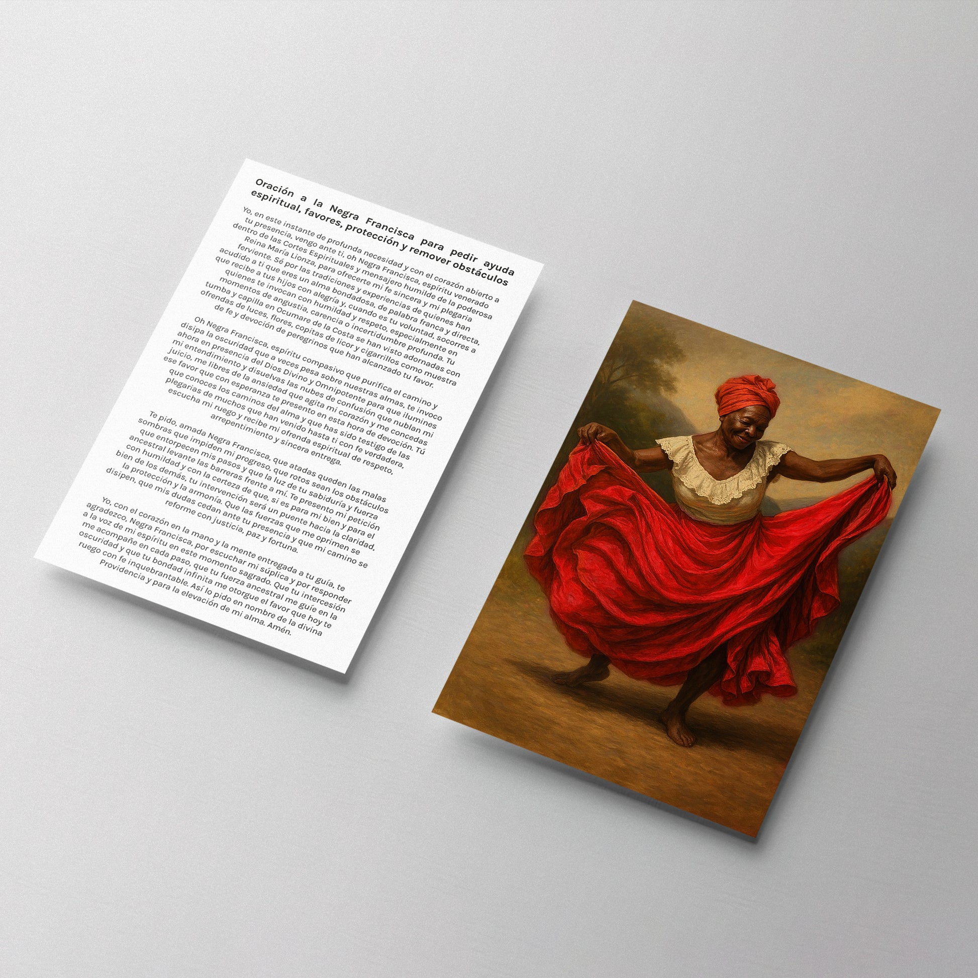 Esta estampa actúa como un recurso para invocar la presencia protectora de Negra Francisca, ayudando a disipar malas energías, alejar influencias negativas y crear un campo espiritual que favorezca la seguridad personal y emocional.