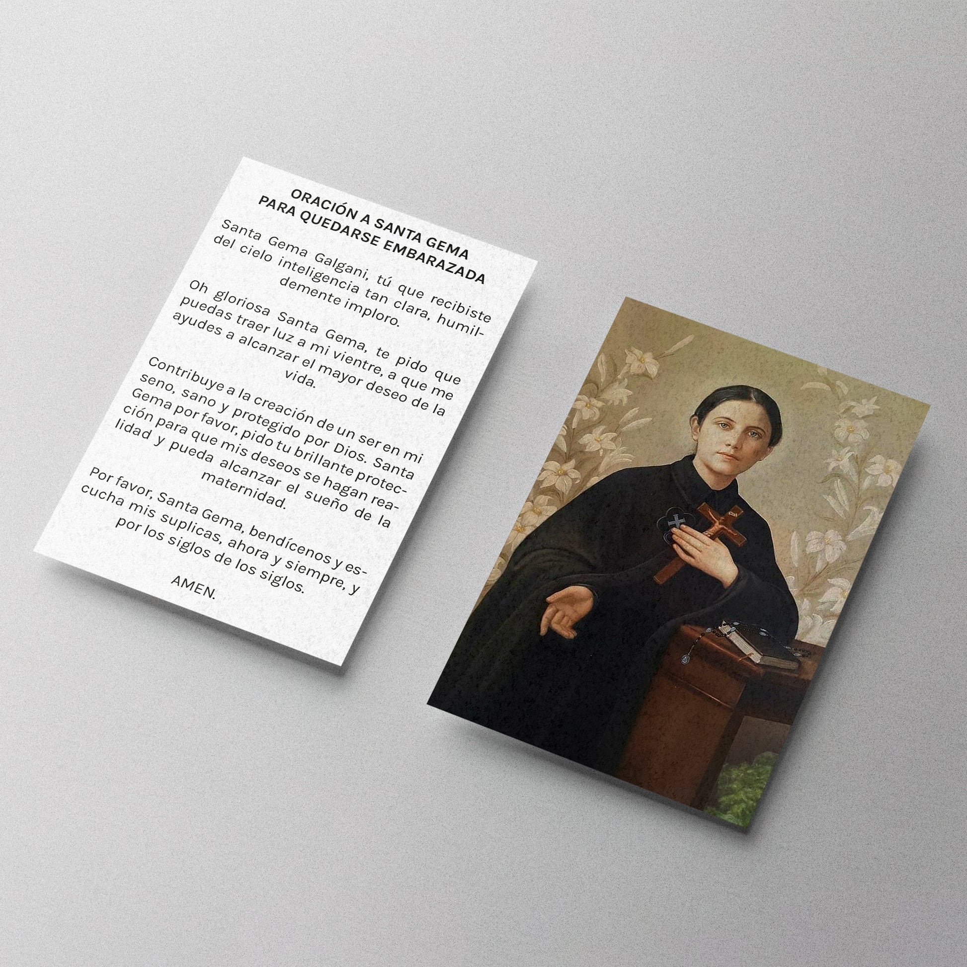 Además de la imagen de Santa Gema, la estampa también incluye una oración especial impresa en la parte posterior. Esta oración está cuidadosamente seleccionada para invocar la intercesión de Santa Gema en peticiones para quedarse embarazada. La oración proporciona un punto de enfoque para la reflexión personal y la conexión con la espiritualidad de Santa Gema.