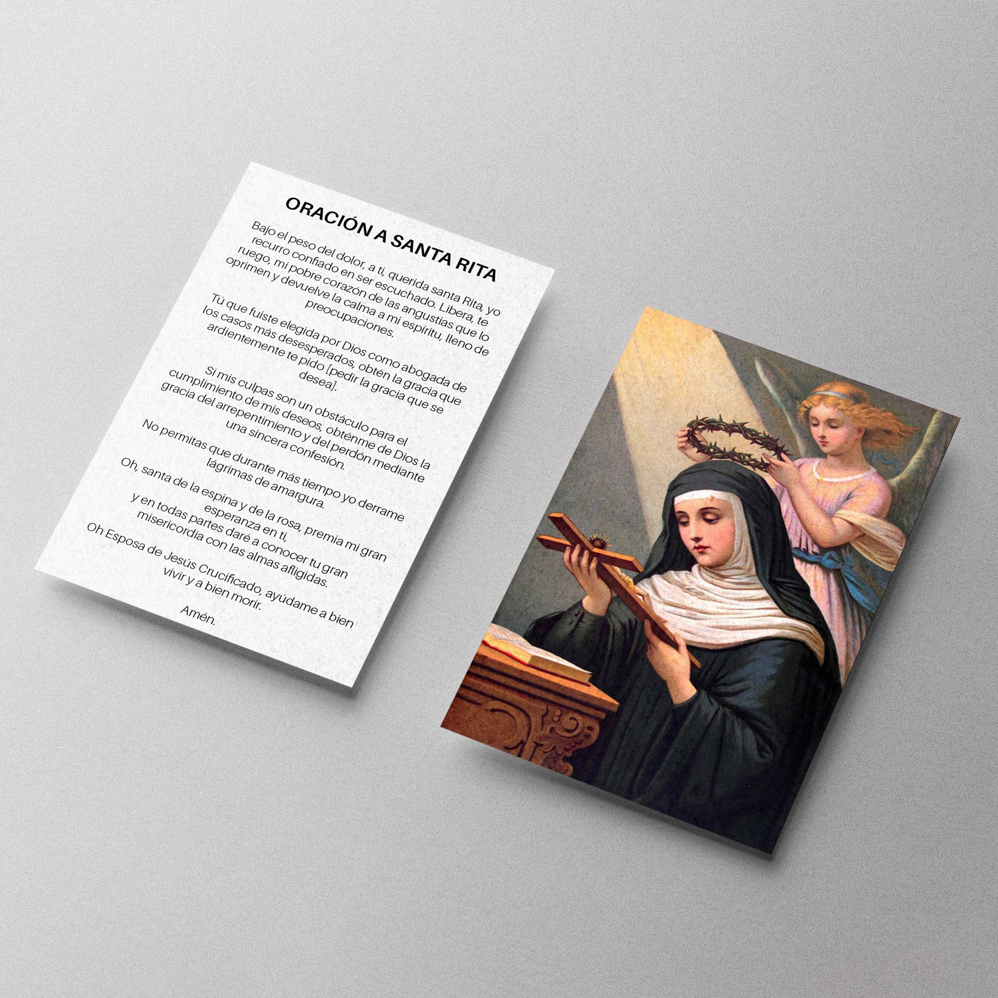 Lo único que tienes que hacer es comprar esta bonita estampa de Santa Rita. Y cuando quieras rezar, sácala de tu cartera o bolso.