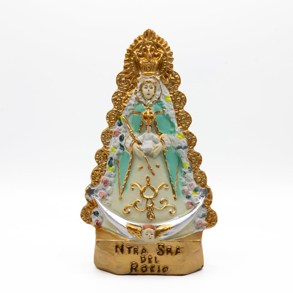 1. Figura de la Virgen del Rocío: La figura representa a la Virgen del Rocío, una entidad espiritual venerada en la cultura andaluza. Su imagen es conocida por aportar paz, protección y bendiciones a quienes la honran.