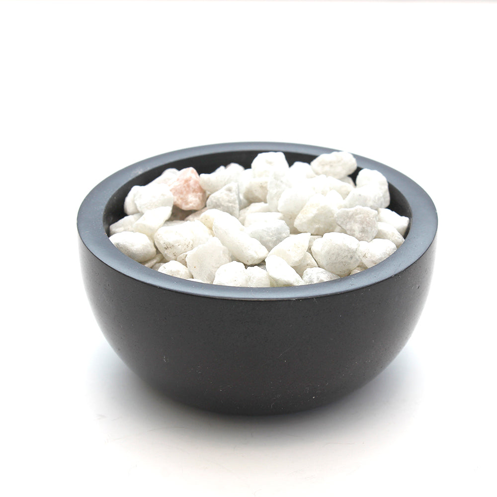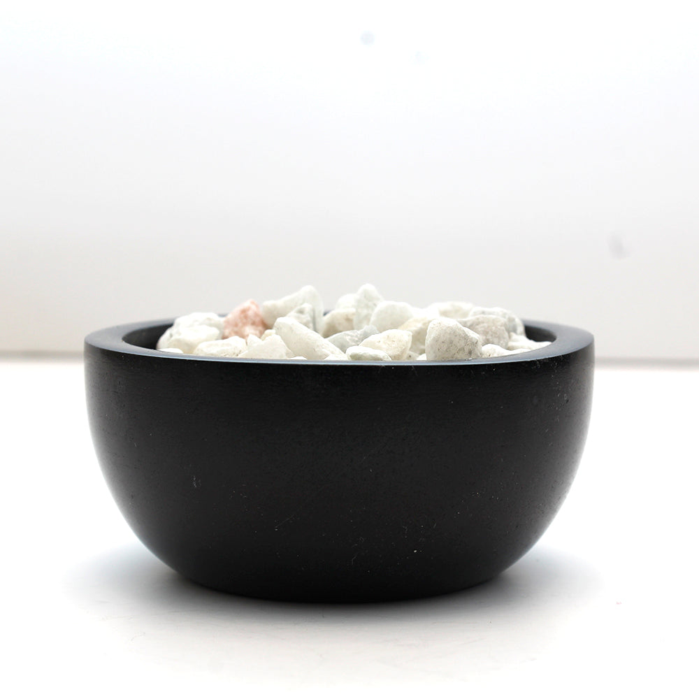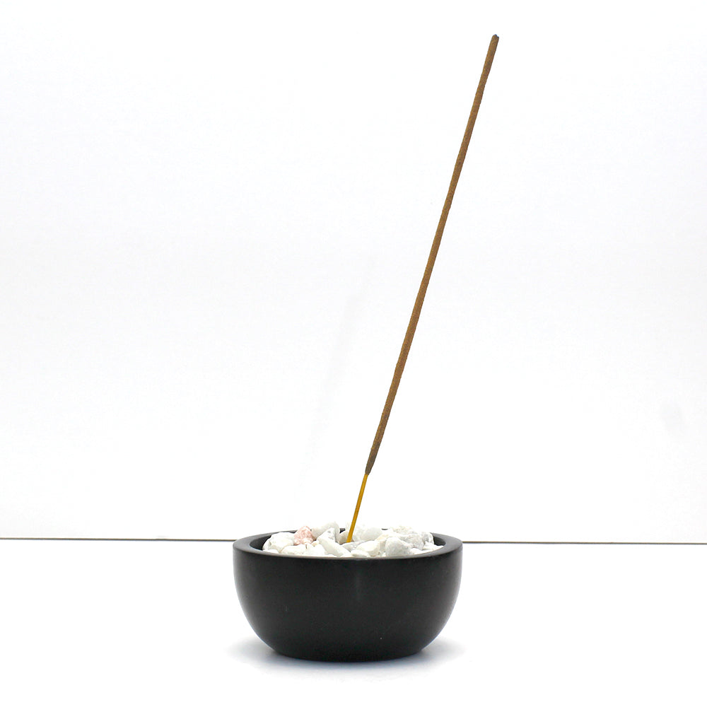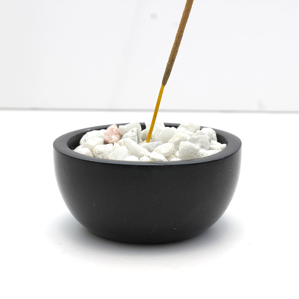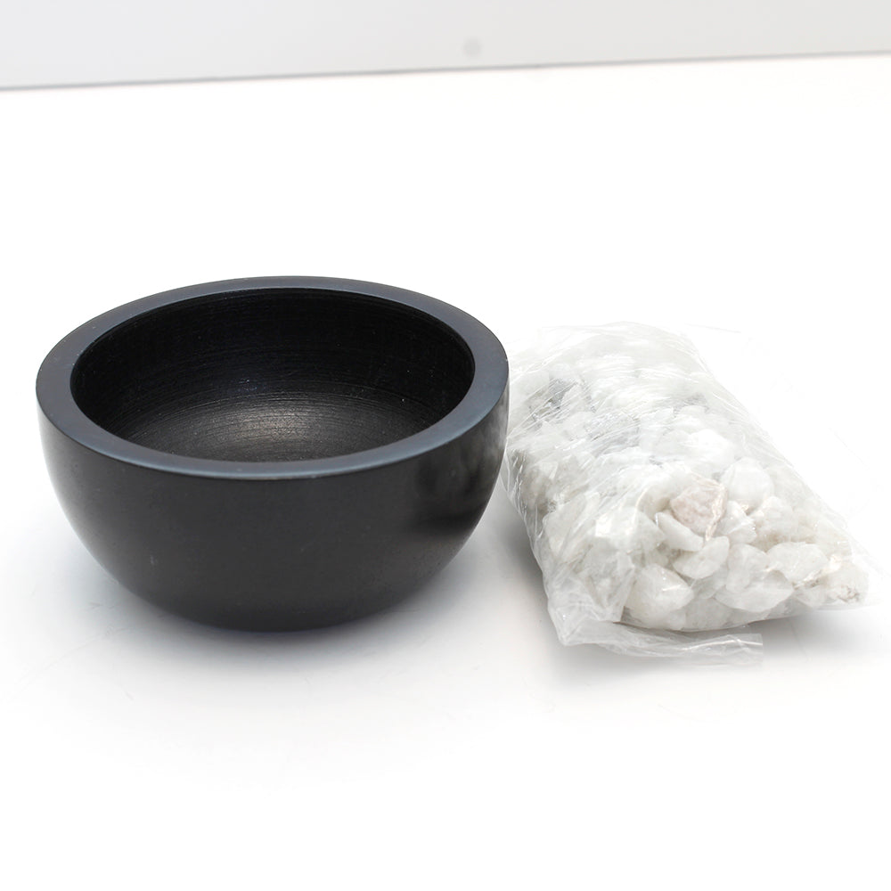 Cuenco para inciensos en piedra esteatita negro con piedras blancas.