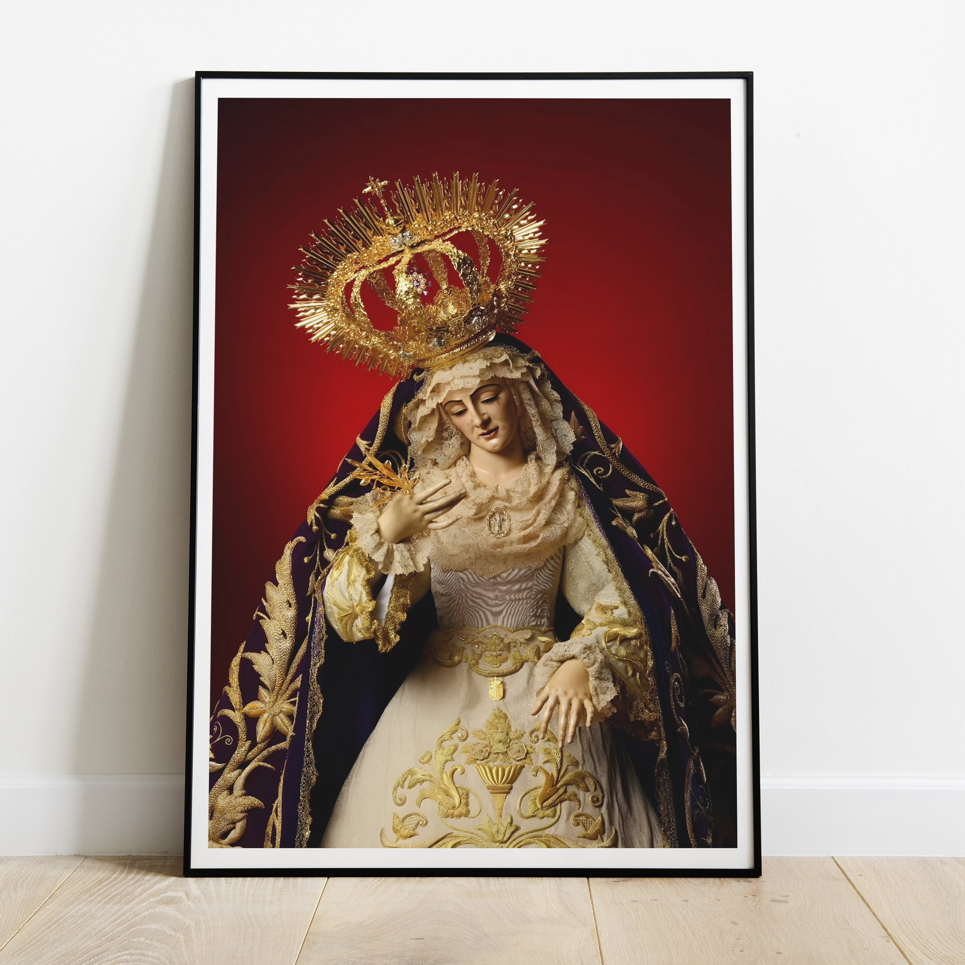 Alta calidad artística: Esta lámina está diseñada con detalles precisos que capturan la serenidad y belleza de la Virgen de los Dolores, reflejando la rica tradición cristiana y el fervor religioso de su comunidad.