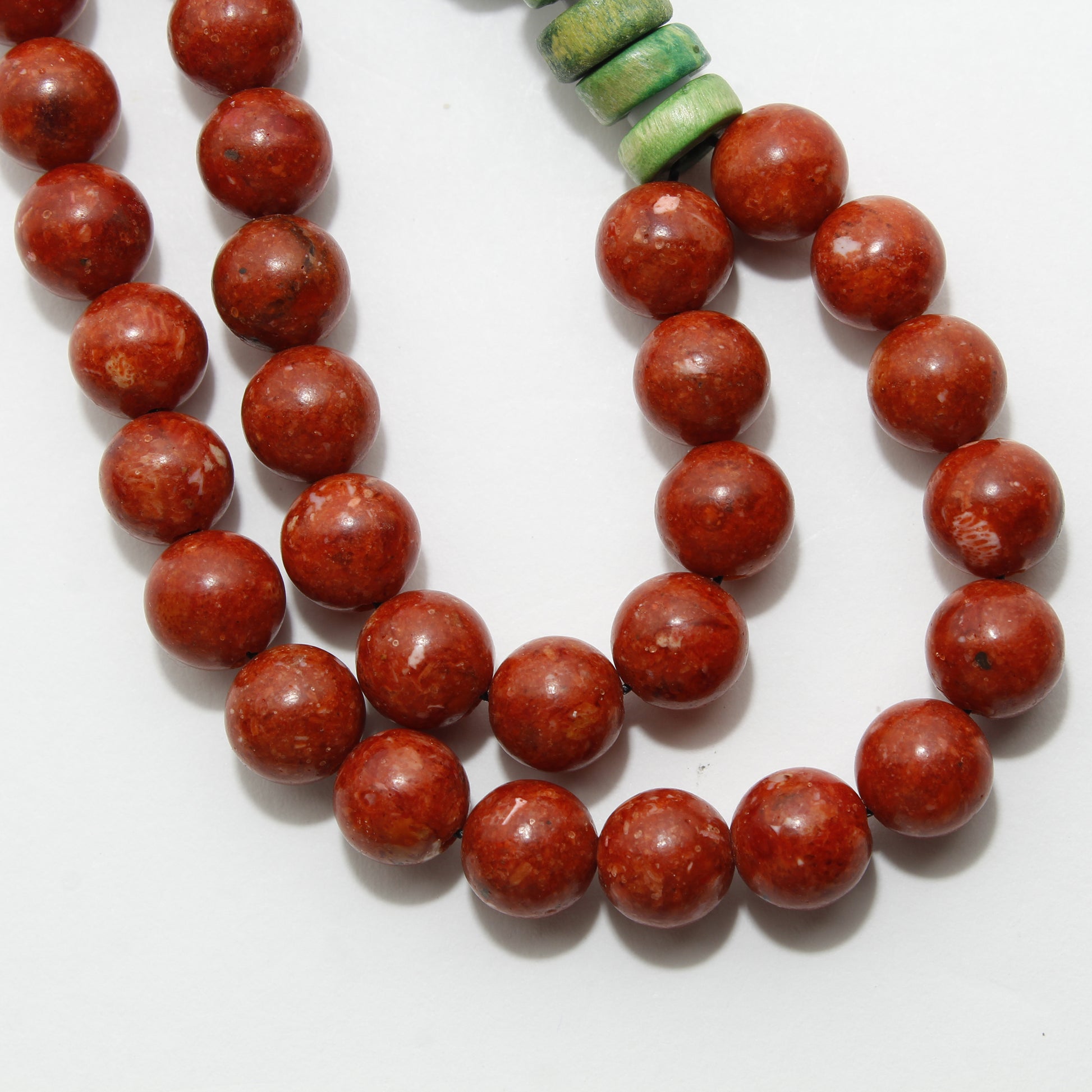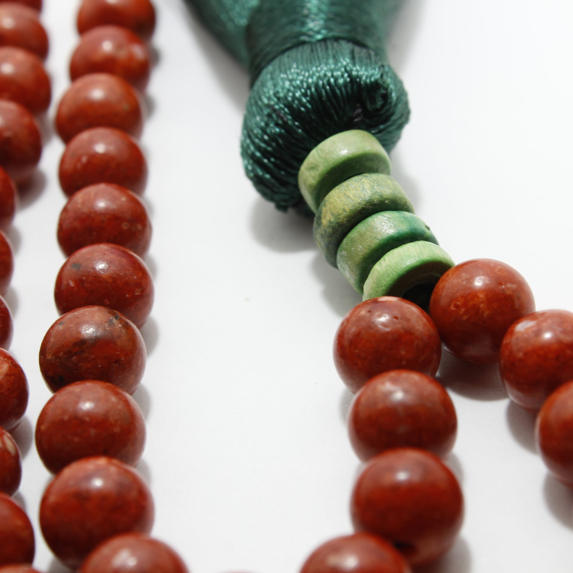 Este mala contiene las 45 cuentas de autentico Coral 100% natural mas 4 cuentas de madera color verde.