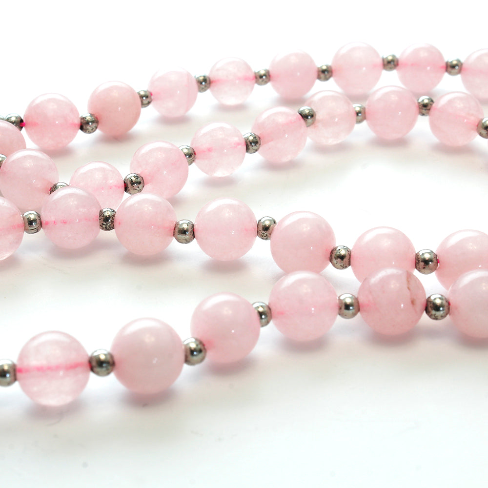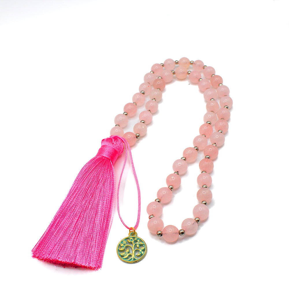 Este mala contiene las 45 cuentas de autentica piedra preciosa cuarzo rosa 100% natural mas 1 amuleto Árbol de la vida