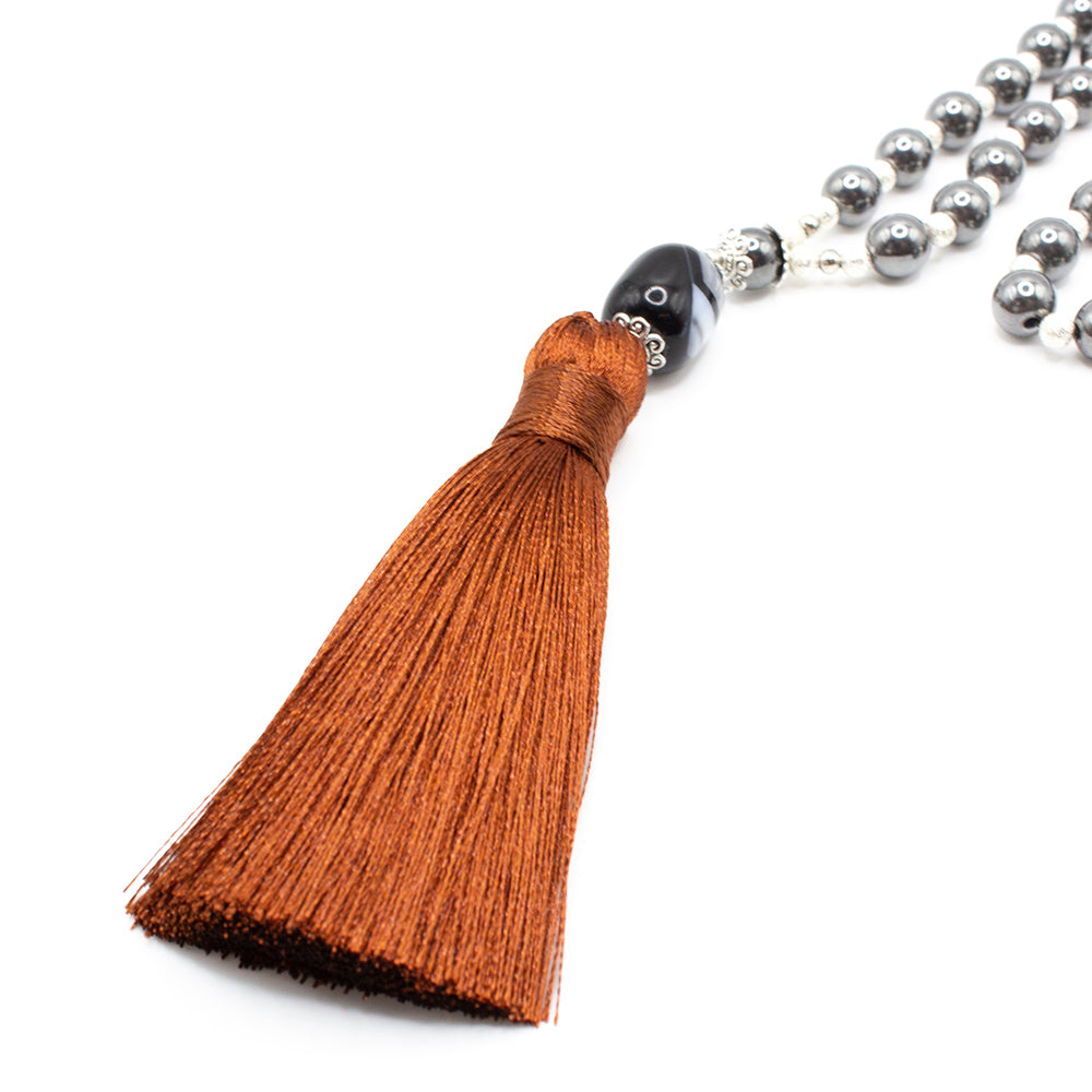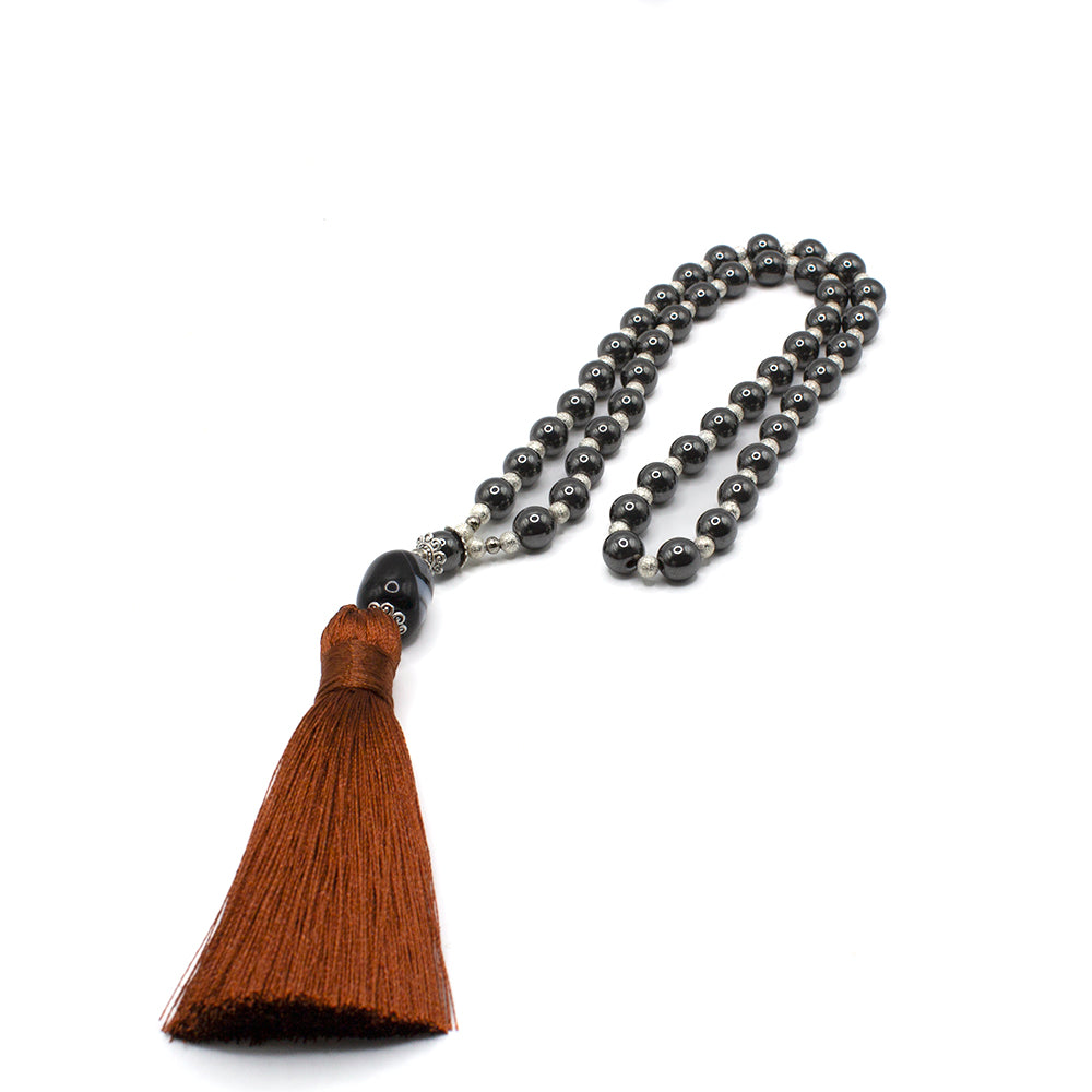 - Estos malas son exclusivos y no se encuentran en otro lugar. Cada uno es único, ya que las cuentas de hematites pueden variar ligeramente en tono y forma, añadiendo un toque personal a tu accesorio espiritual.