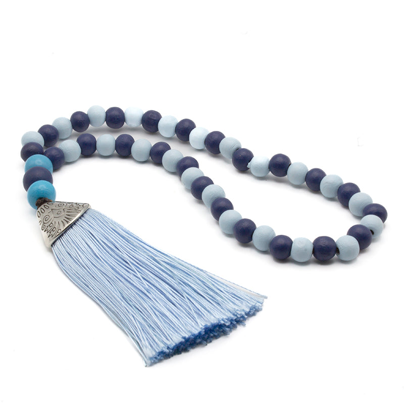 MALA DE 45 CUENTAS MADERA COLOR AZULES Y CELESTES CON BORLÓN CELESTE