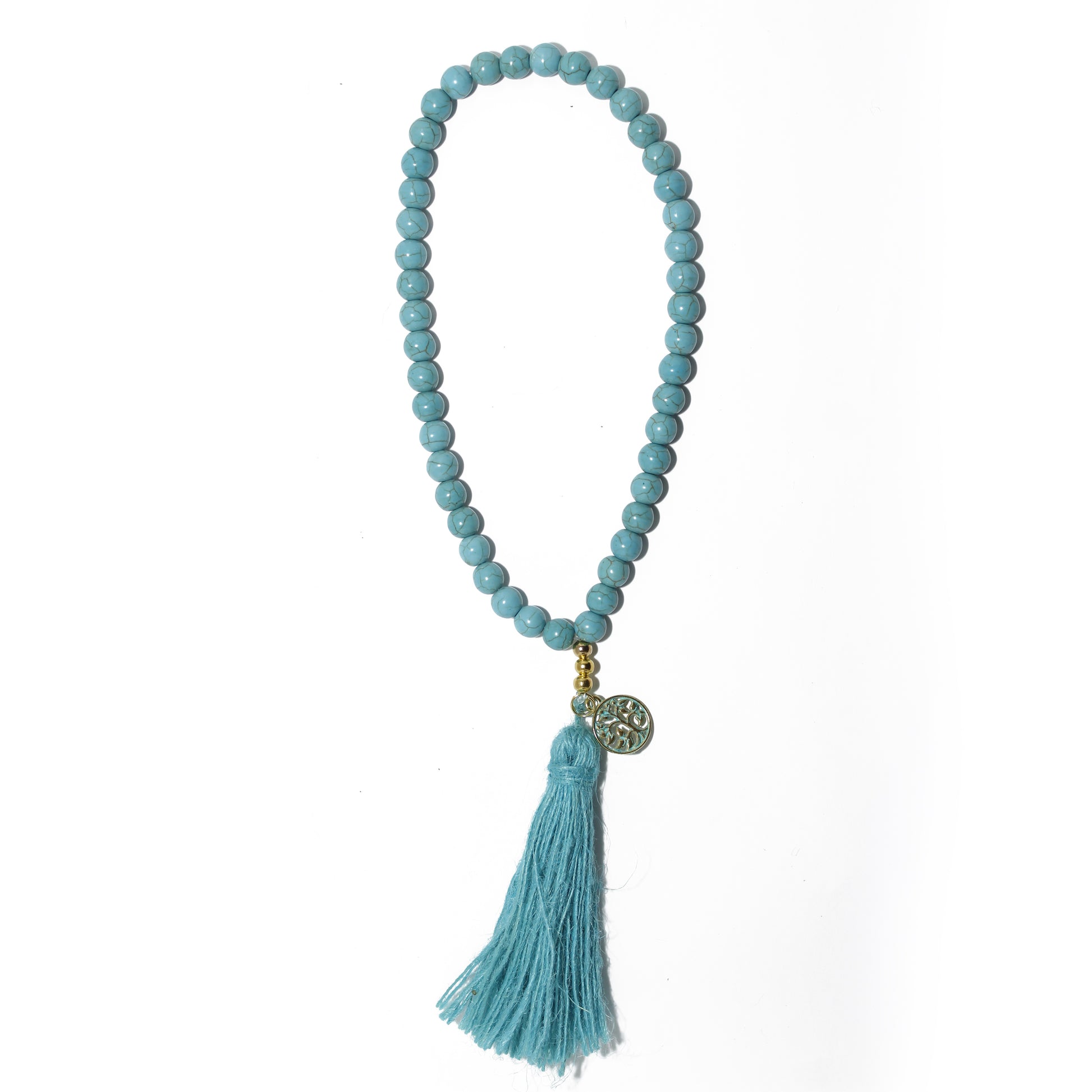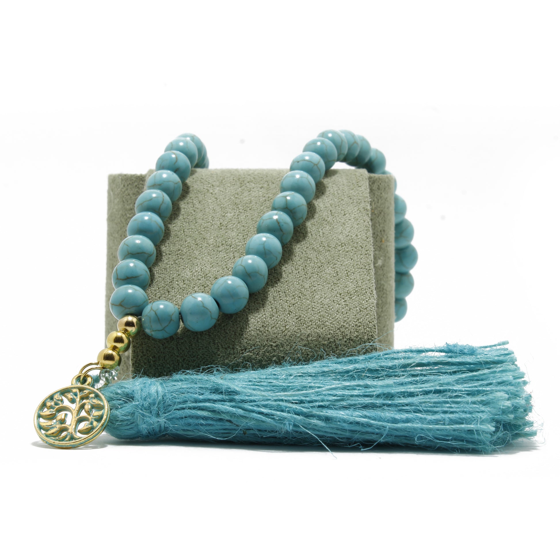 Este mala esta compuesto por 45 cuentas de piedra preciosa turquesa 100% natural y un amuleto del árbol de la vida.