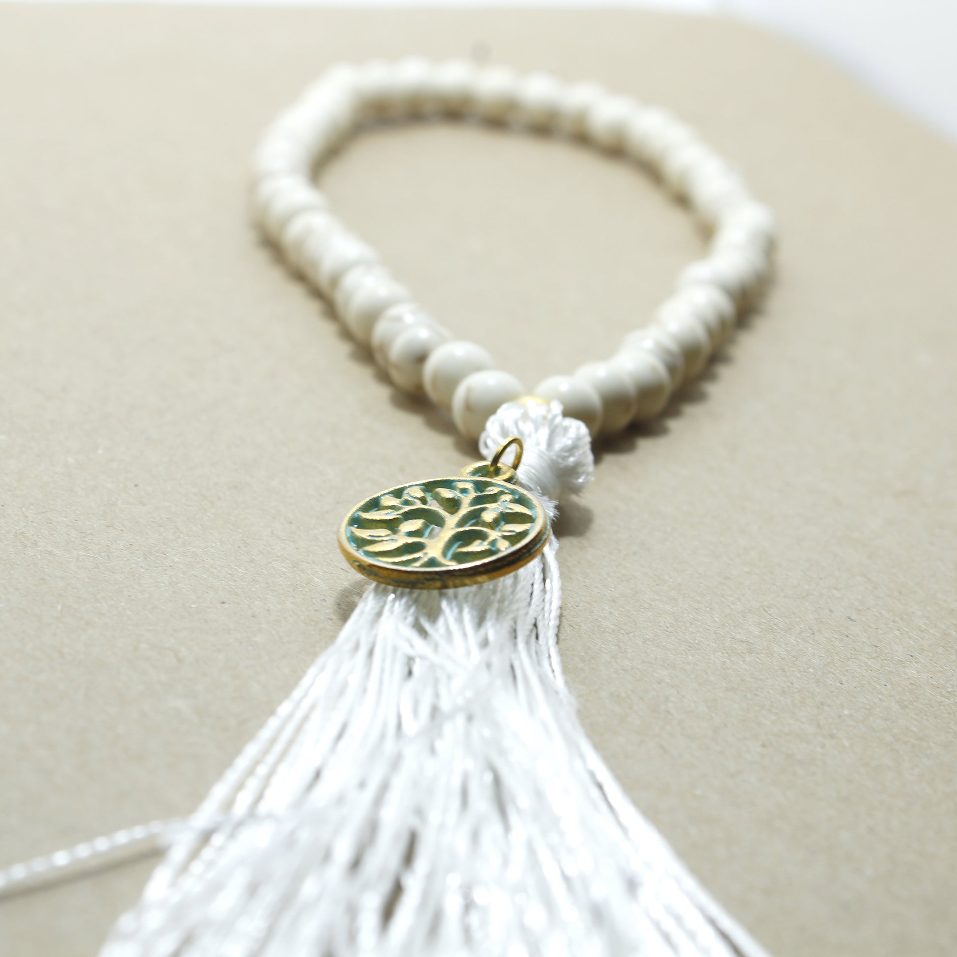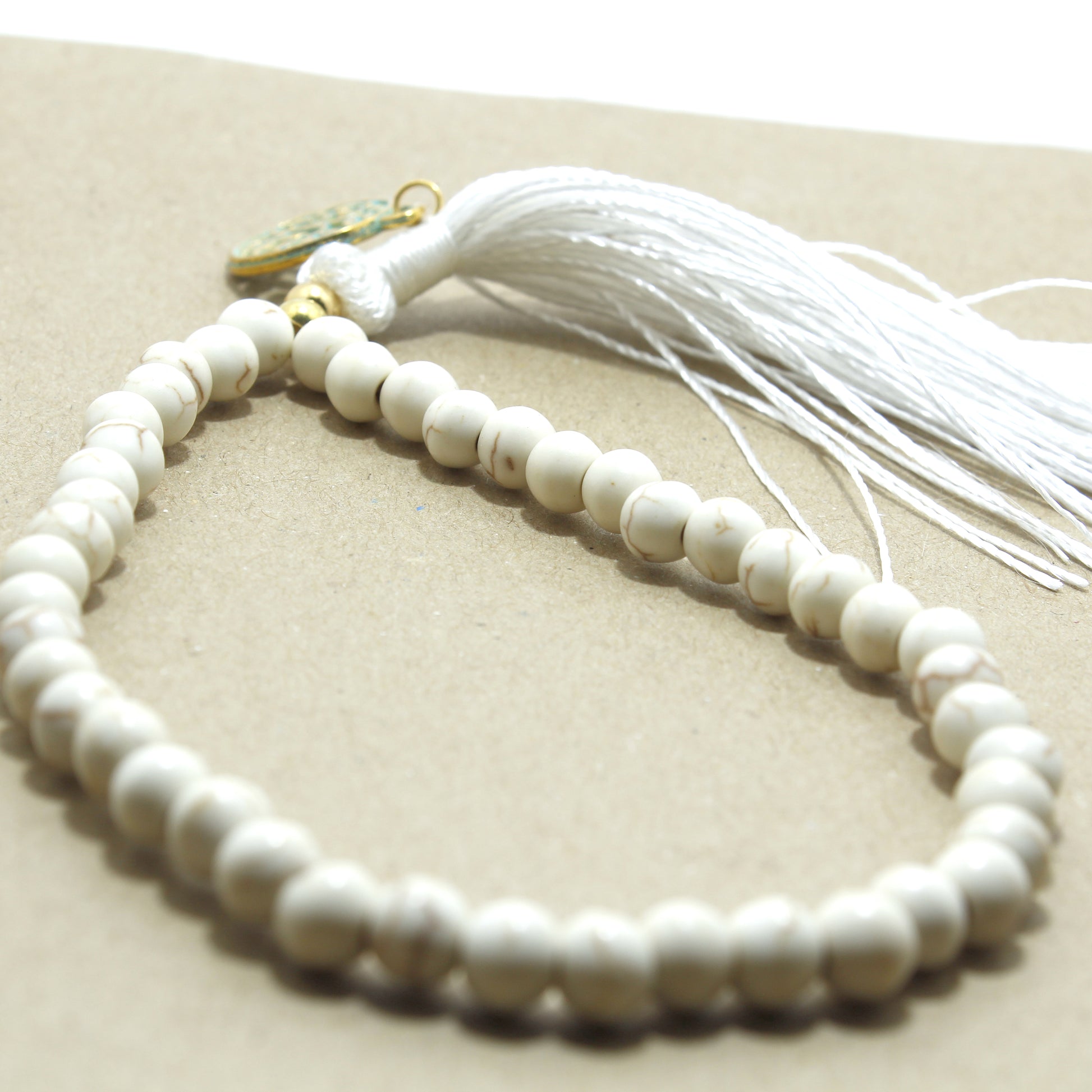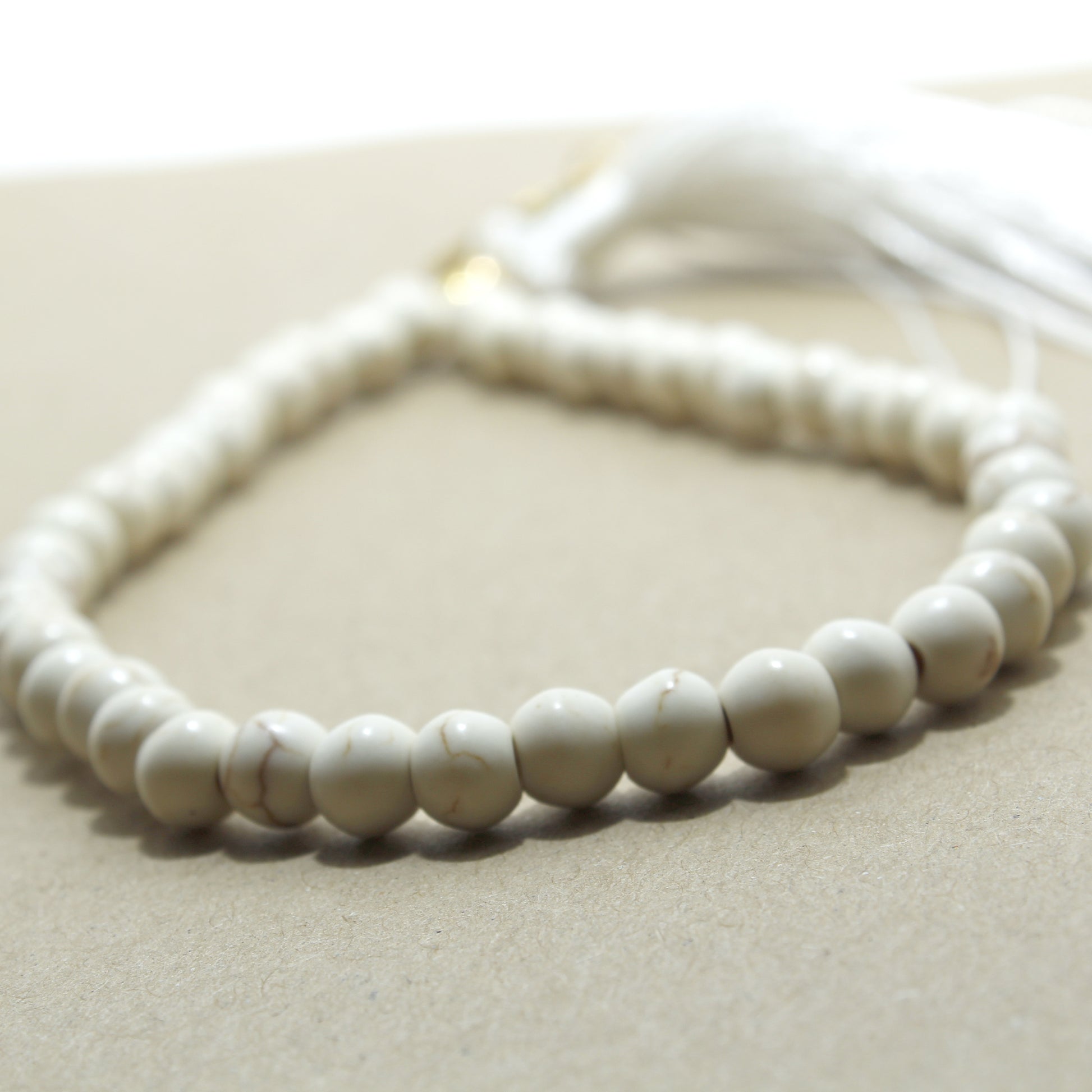 Este mala contiene las 45 cuentas de autentica piedra preciosa turquesa blanca 100% natural mas 2 cuentas de color dorado que representan el amor, la felicidad, la fortuna, el éxito y la buena suerte.