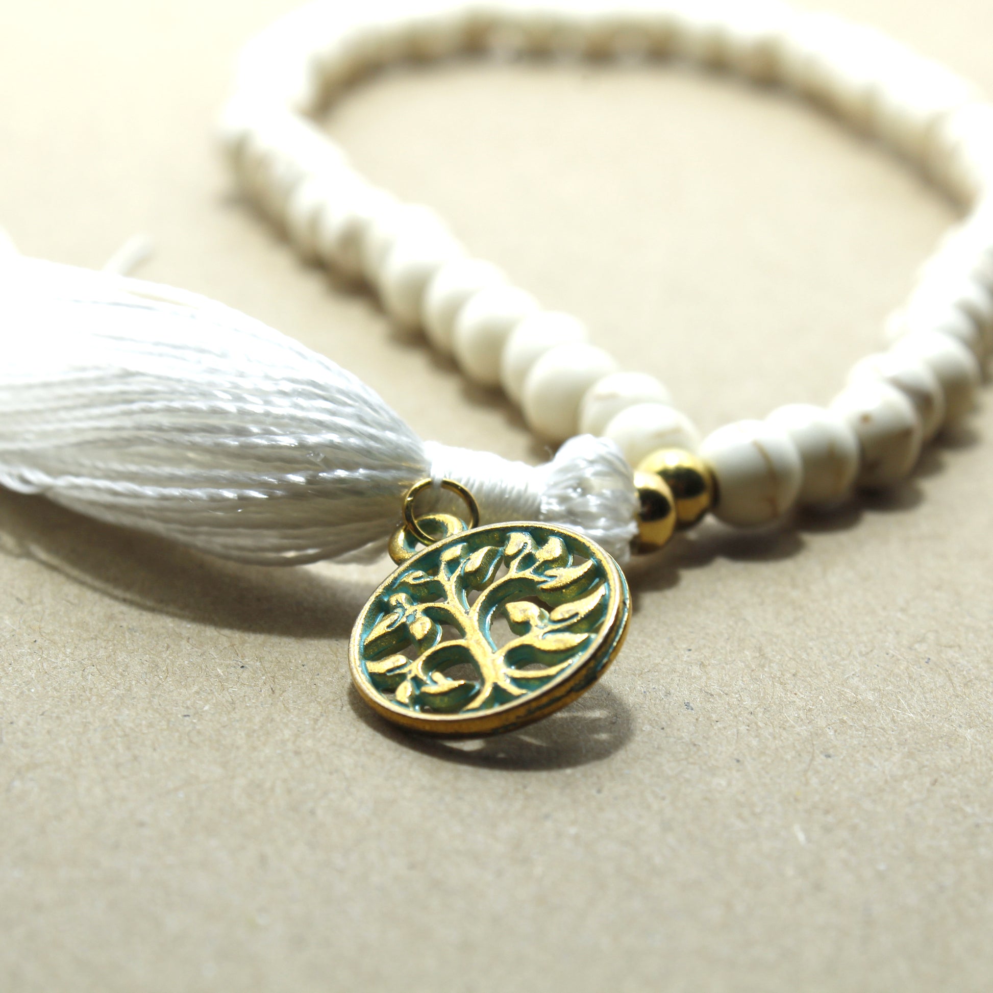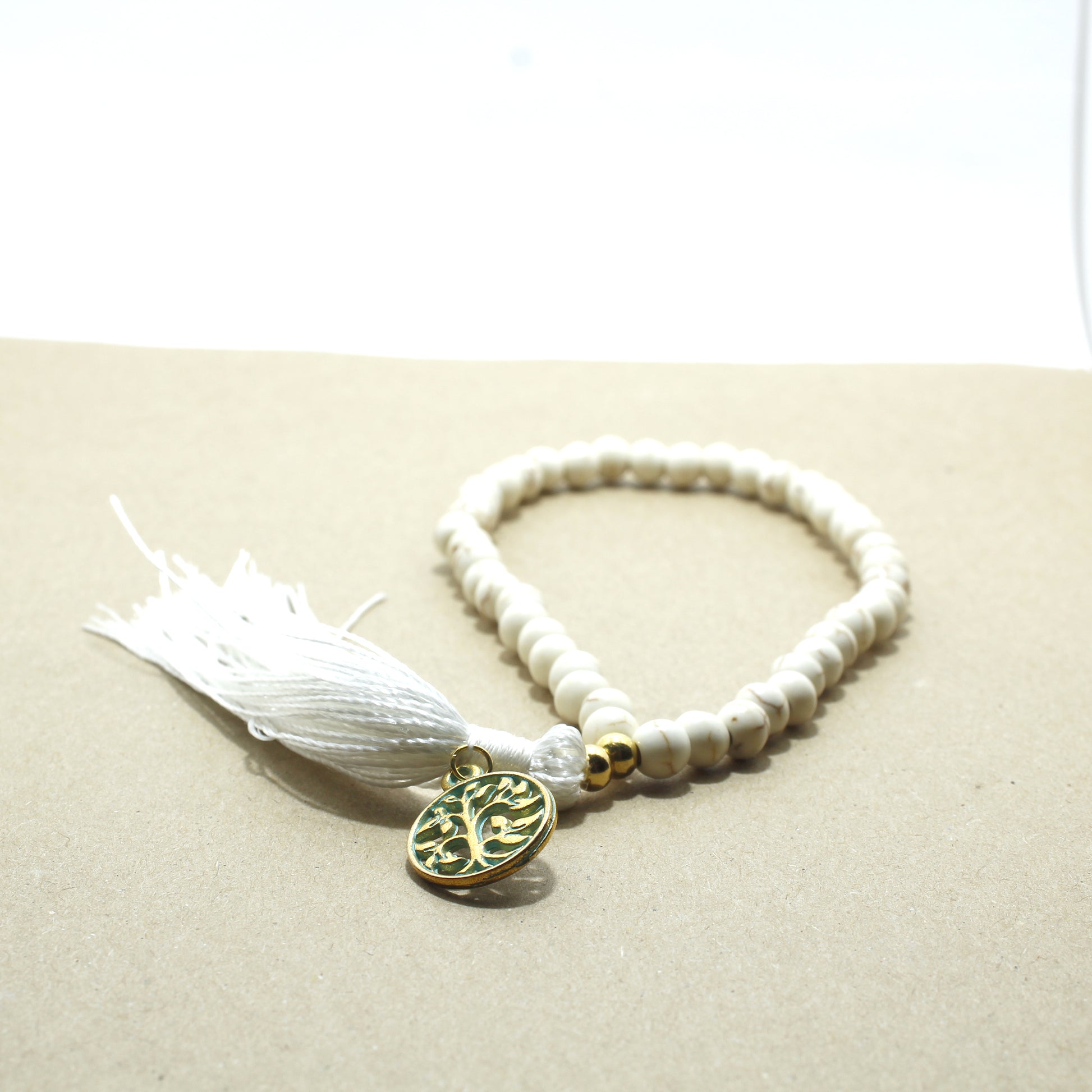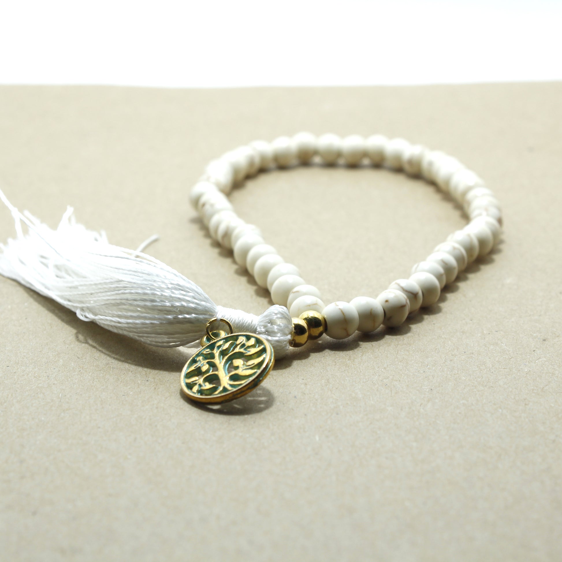 Este mala contiene las 45 cuentas de autentica piedra preciosa turquesa blanca 100% natural mas 2 cuentas de color dorado que representan el amor, la felicidad, la fortuna, el éxito y la buena suerte.