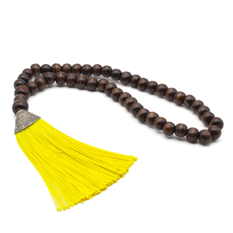 MALA DE 45 CUENTAS MADERA COLOR CAOBA Y BORLÓN AMARILLO