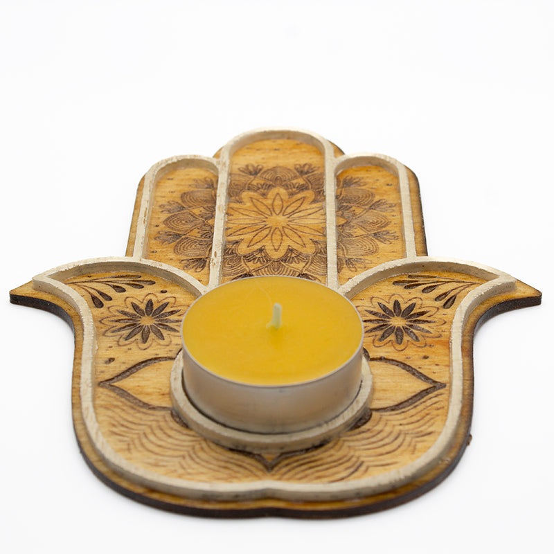 PORTAVELAS ESOTÉRICO MANO DE FÁTIMA EN MADERA GRABADA PARA VELAS DE TÉ