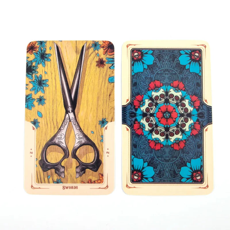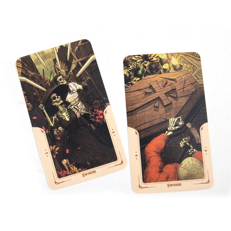 Estas cartas de Tarot se basan en el simbolismo y las imágenes asociadas con la Santa Muerte. Cada carta representa una energía, aspecto o mensaje específico y se utiliza para brindar orientación y claridad en diversas áreas de la vida, como el amor, las relaciones, el trabajo, la salud y la espiritualidad.